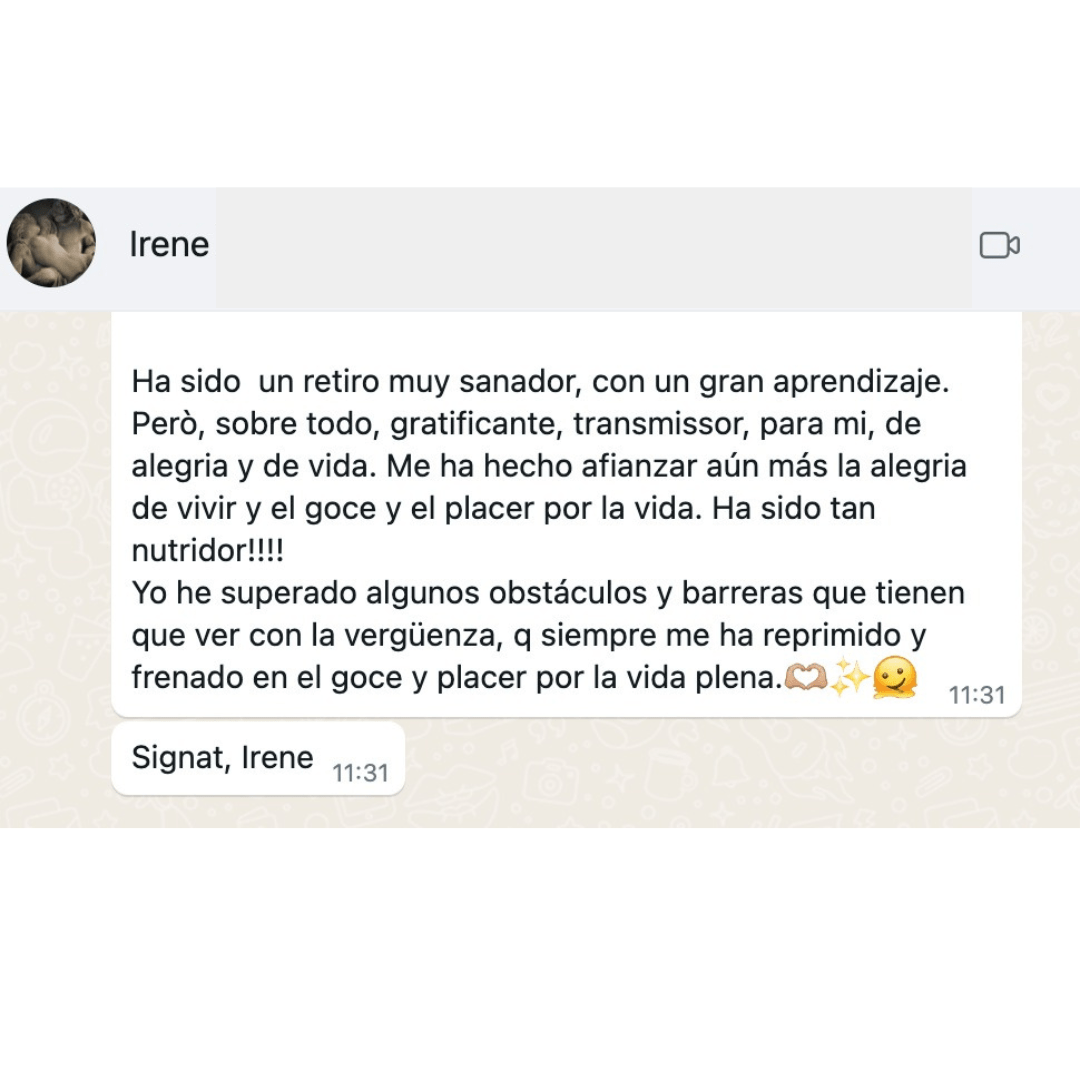 Un proceso vivencial de 3 días donde trabajarás de forma terapéutica, energética, mental, emocional y corporal, en un grupo muy reducido y con acompañamiento directo y muy personalizado